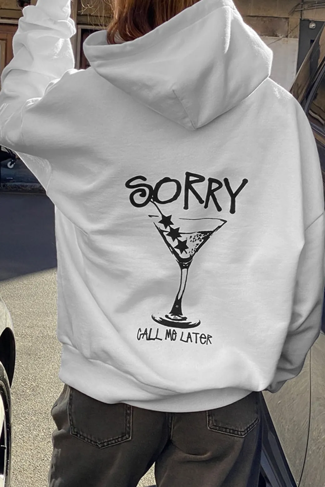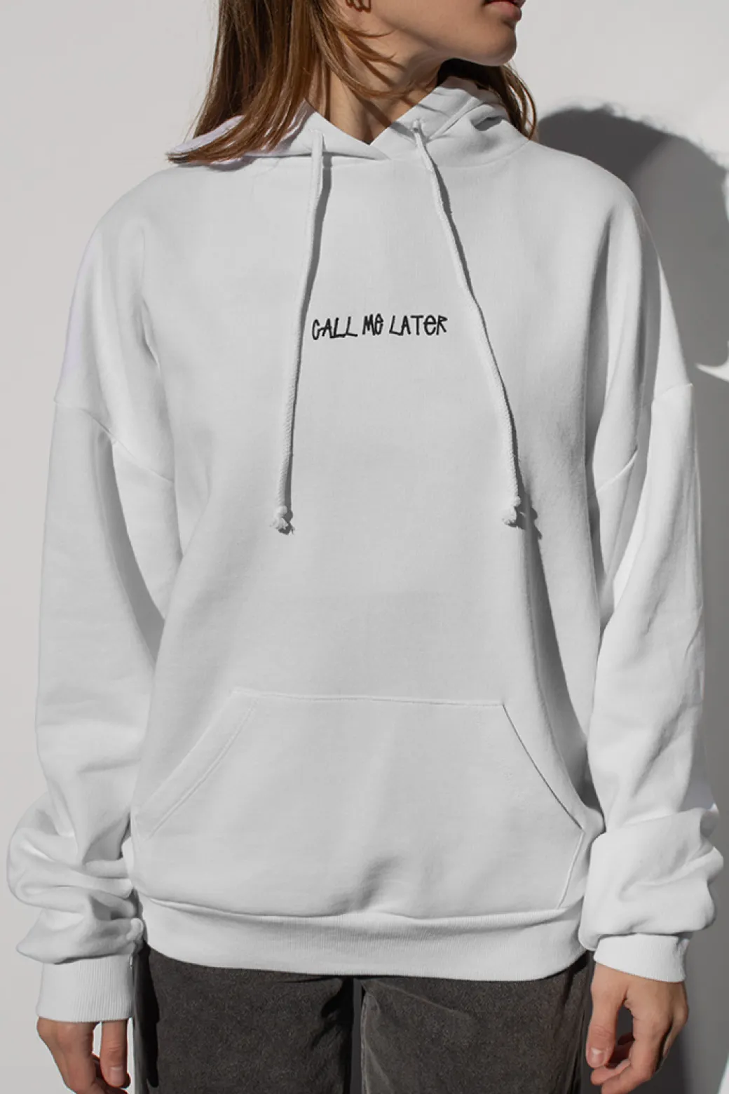 Felpa con stampa Call me later, con cappuccio, tasche frontali, maniche lunghe, lunghezza lunga, vestibilità comoda. Spedizione Express e Reso Facile