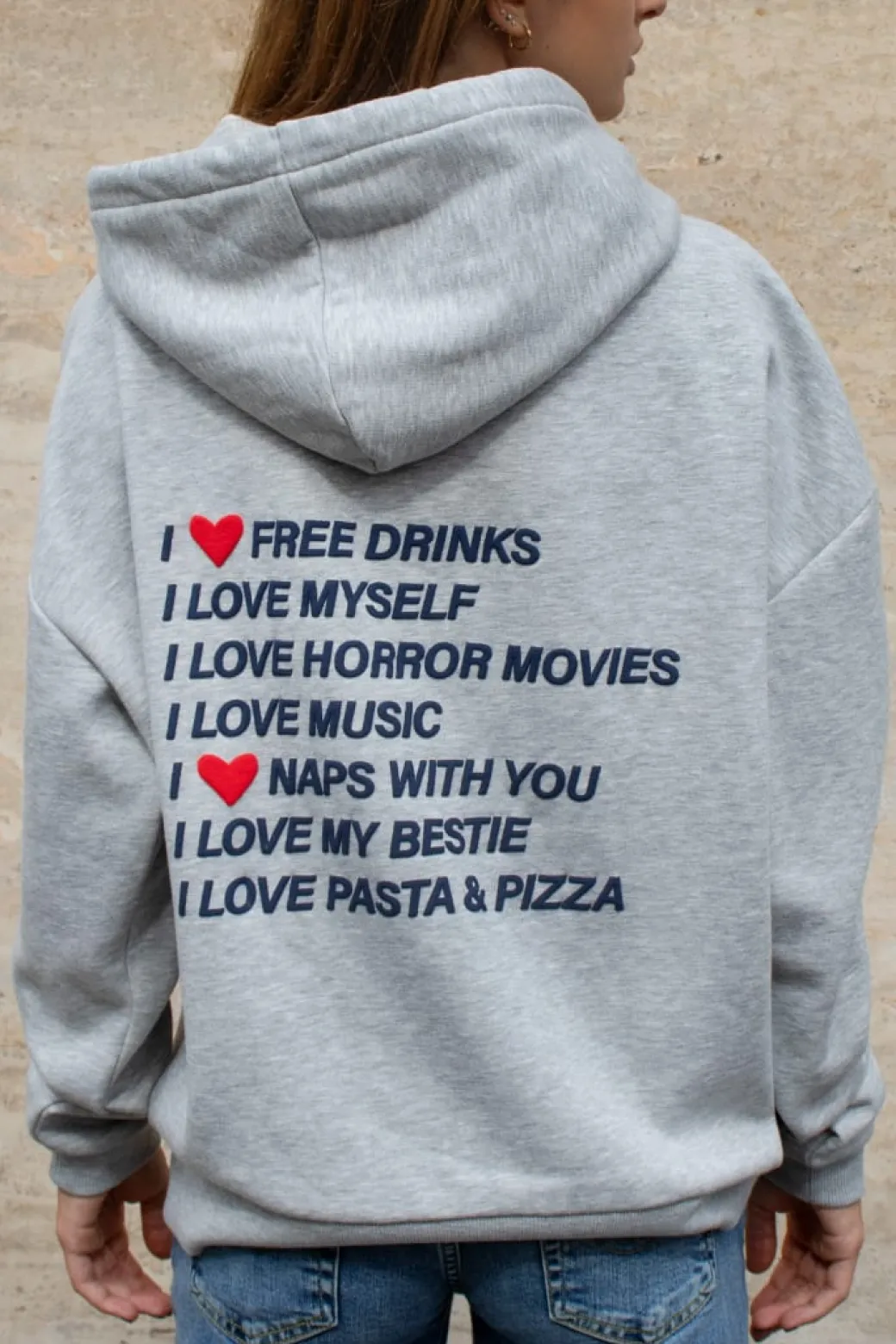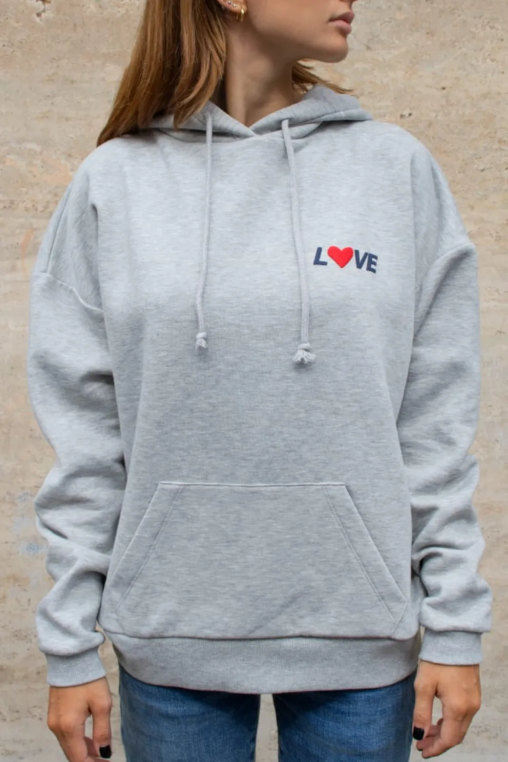 Felpa con stampa fronte retro Love, colore grigio, con cappuccio, tasca frontali, maniche lunghe, lunghezza lunga, vestibilità comoda. Spedizione Express e Reso Facile