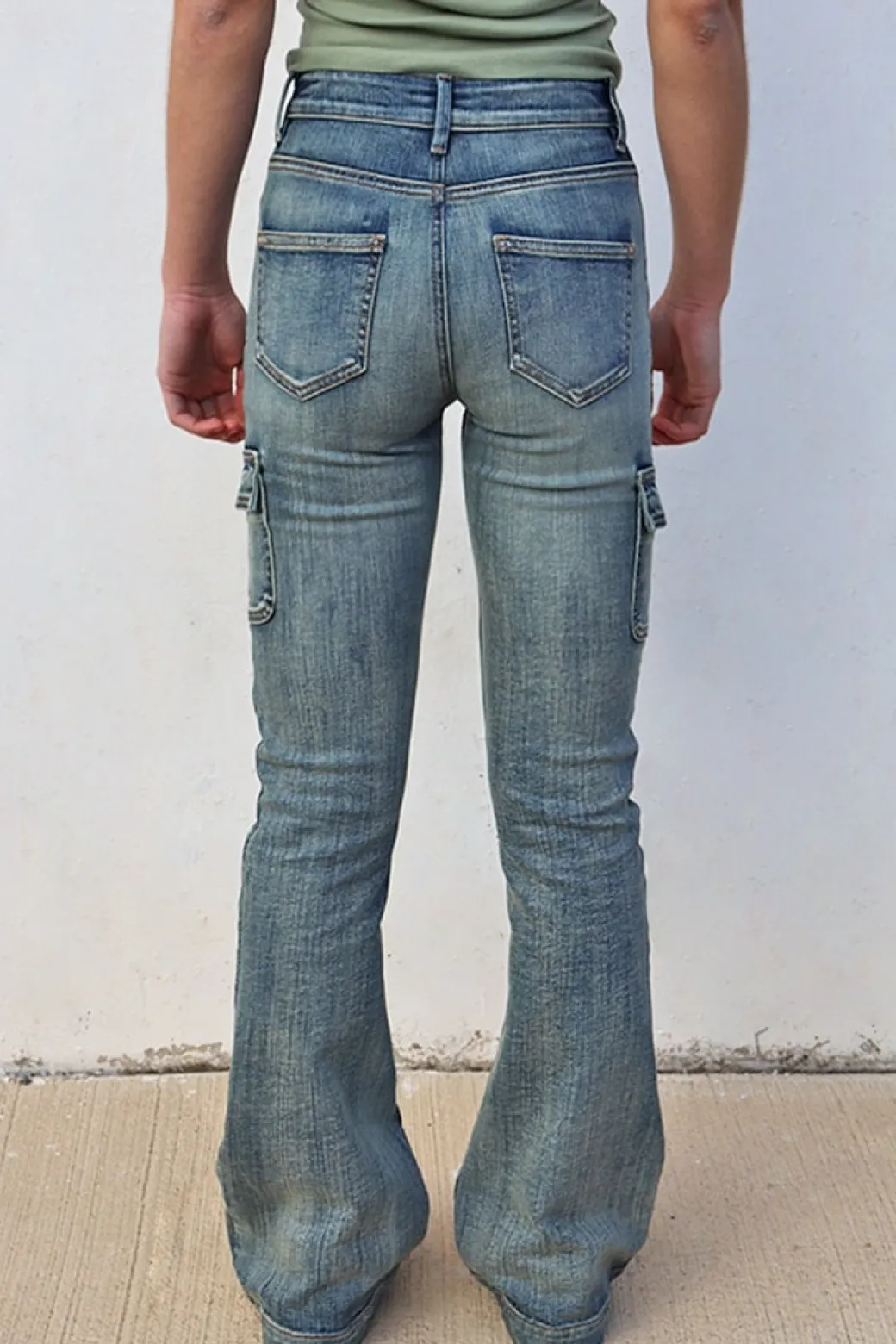 Jeans flare, vita alta, tasche quadrate davanti e tasconi laterali, passanti per cintura, chiusura con bottone e zip, lunghezza regolare, vestibilità slim. Spedizione Express e Reso Facile
