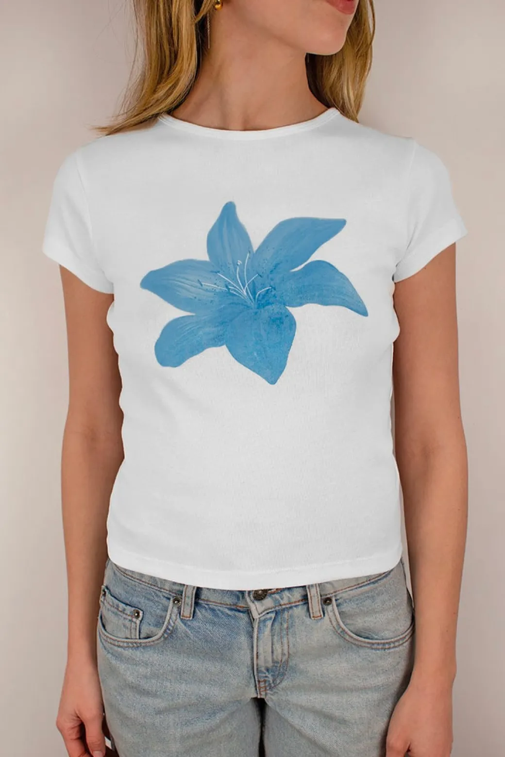 T-shirt con stampa Fiore, girocollo, maniche corte, lunghezza regolare, vestibilità comoda. Spedizione Express e Reso Facile