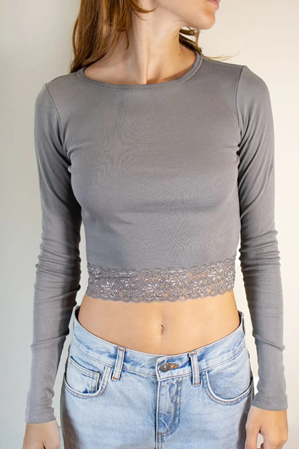 T-shirt con fondo pizzo, girocollo, maniche lunghe, lunghezza crop, vestibilità aderente. Spedizione Express e Reso Facile