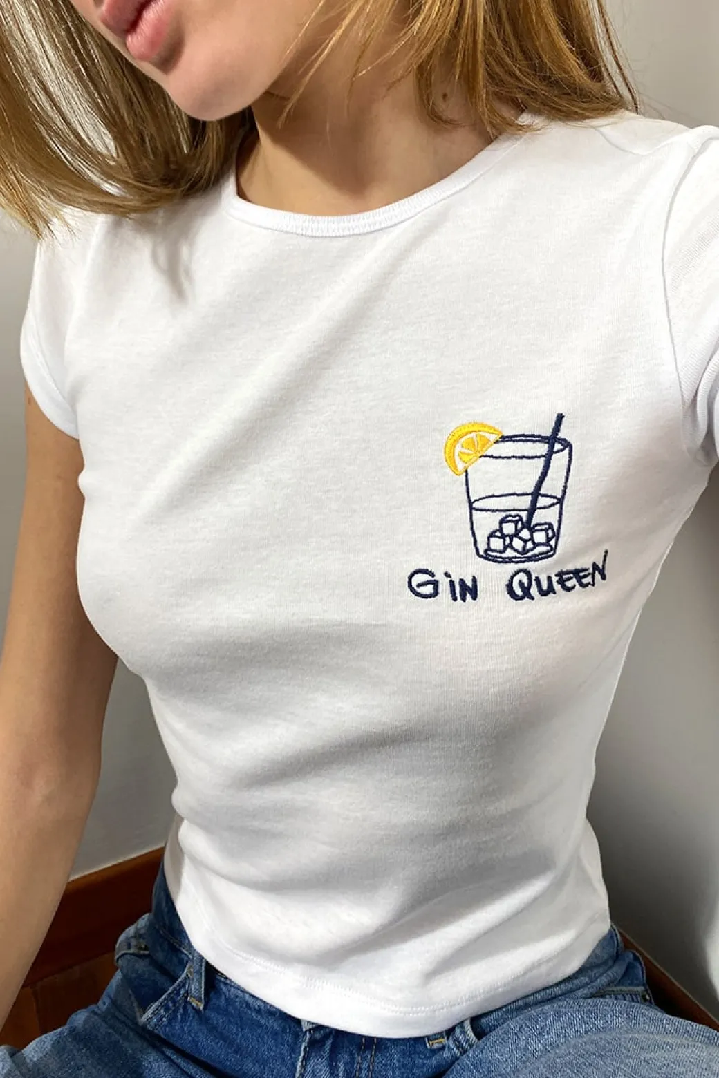 T-shirt con ricamo Gin queen, girocollo, maniche corte, lunghezza regolare, vestibilità comoda. Spedizione Express e Reso Facile