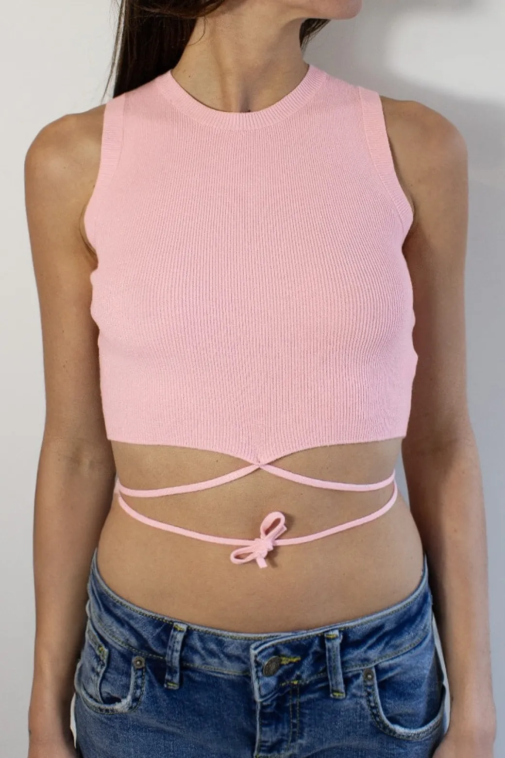 Top crop con lacci, girocollo, smanicato, lunghezza crop, vestibilità aderente. Spedizione Express e Reso Facile
