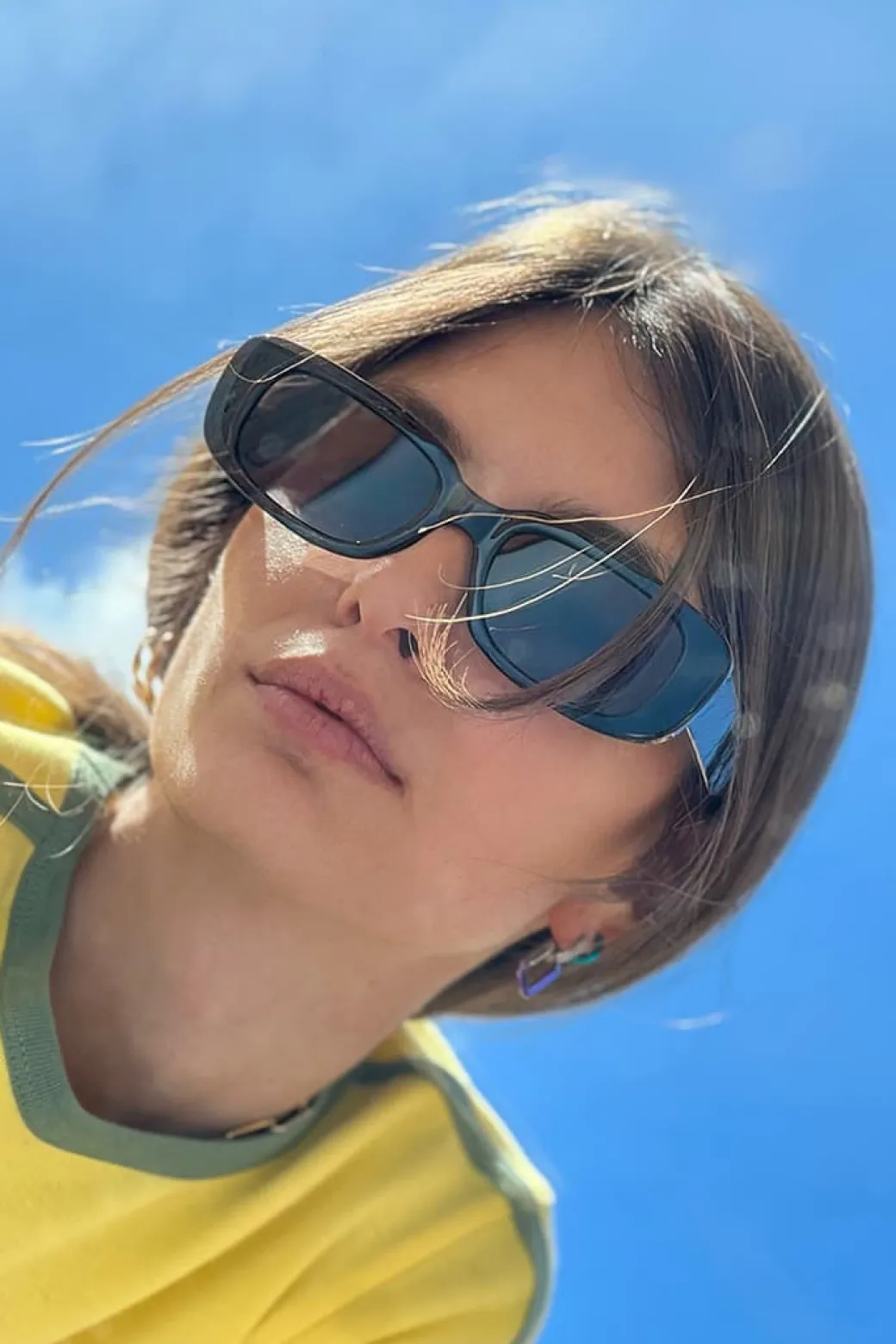Occhiali da sole, forma rettangolare, montatura in plastica, stanghette spesse con estremità ricurve. Spedizione Express e Reso Facile
