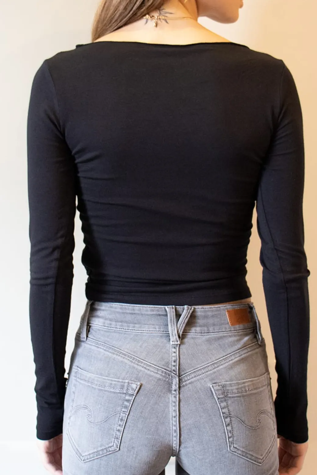T-shirt scollo a barchetta, dettaglio con scollatura arricciata, maniche lunghe, lunghezza regolare, vestibilità slim. Spedizione Express e Reso Facile